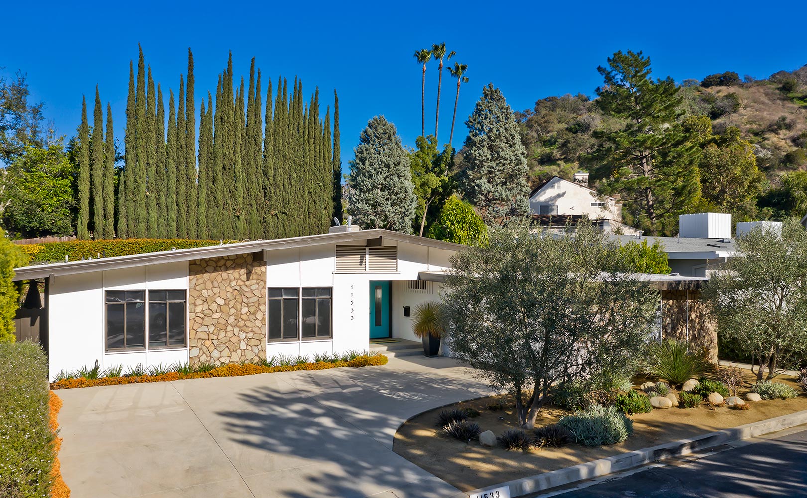Exceptional Mid-Century single story architectural gem on a serene, flat cul-de-sac in Studio City's West Donas. This finely crafted 2000+ sq. ft., 3 bd, 2.5 bath home tastefully blends original 60's style with today's living. Boasting an open floor plan, concrete floors throughout, vaulted ceilings, gas fireplace, open air atrium with fountain, gorgeous pool/spa and an outdoor firepit with built-in seating, this home is an entertainer's dream. A lux master suite, mature landscaping, two-car direct access garage and dedicated laundry room complete the package. Extensively renovated in 2014, the updates include a new roof, plumbing, electrical and solar panels. All perfectly located in the Carpenter School District and centrally located between the city and valley.